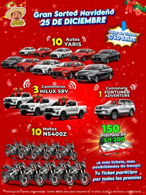 El sorteo se realizará el martes 30 de septiembre a las 5:00 p.m y se transmitirá por la página oficial de facebook: PREMIOS LORENZO